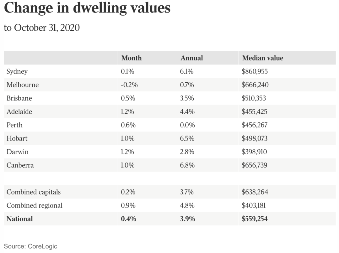 不過根據地產研究機構CoreLogic最新的數據顯示:自疫情爆發以來,澳洲房價首次出現了整體上漲10月份澳洲全國住宅房產價格整體上漲了0.4%,中位價達到559254澳元除了遭受第二波疫情的墨爾本房價仍有小幅下降之外,其他首付城市房價均在上漲。業內專業人士稱,各種數據表明澳洲房市或以觸底。