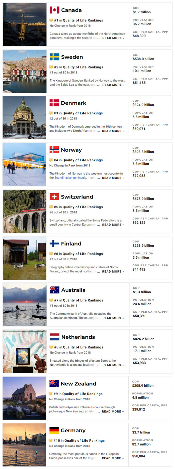 對(duì)于移民申請(qǐng)者來(lái)說(shuō),移民目的國(guó)的生活質(zhì)量是他們最關(guān)心的方面之一。《2019全球國(guó)家生活質(zhì)量排名》就成為今年U.S.News排行中受關(guān)注最多的子榜單之一。