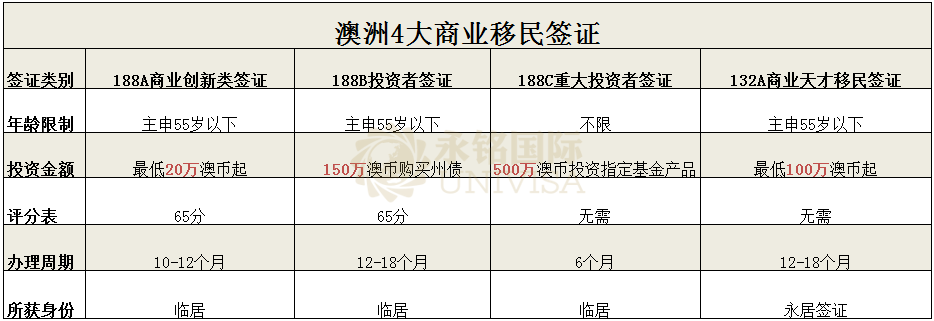 我們先通過(guò)下圖簡(jiǎn)單了解下澳洲四大商業(yè)移民類別:188A商業(yè)創(chuàng)新簽證、188B投資者簽證、188C重大投資者簽證和132商業(yè)天才簽證。下文我們就這四大商業(yè)移民簽證居住要求大起底!