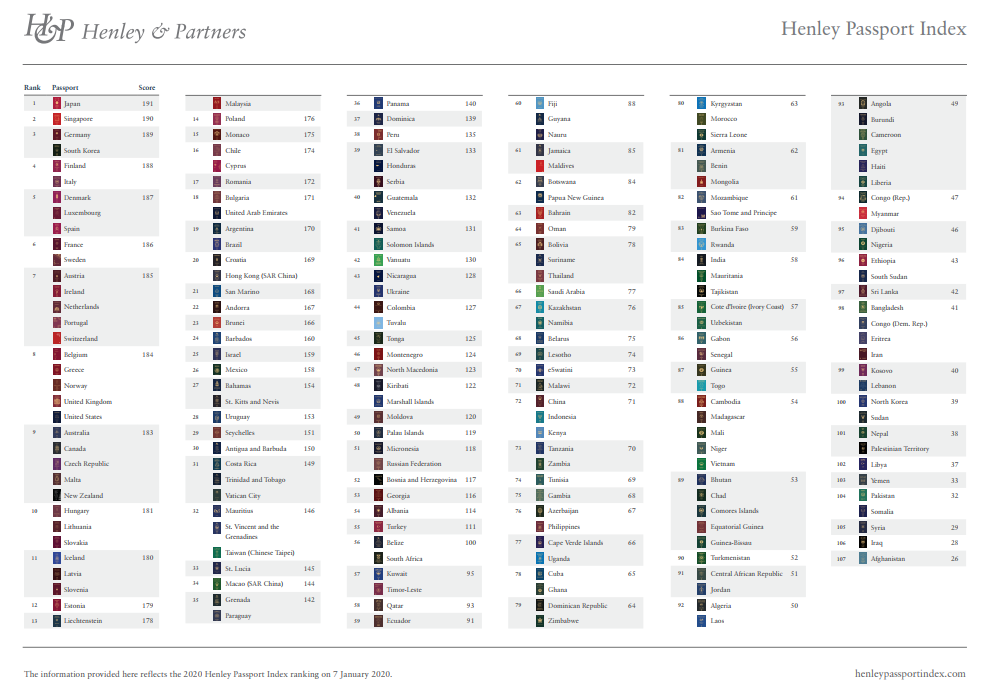 亨氏護(hù)照指數(shù)是Henley&Partners公司根據(jù)國(guó)際航空運(yùn)輸協(xié)會(huì)(IATA)提供的數(shù)據(jù),分析和研究全球國(guó)家和地區(qū)的護(hù)照持有人,在免簽或落地簽的情況下可以入境的國(guó)家或地區(qū)數(shù)量。2020年的排行榜涵蓋了全球199個(gè)國(guó)家及地區(qū)。