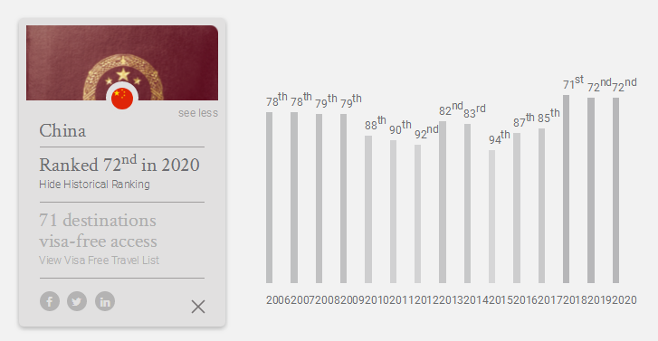 此外,大家非常關(guān)注的中國(guó)大陸護(hù)照,今年和去年一樣排在第72位,有71個(gè)免簽/落地簽?zāi)康牡亍V袊?guó)香港排第20位,免簽/落地簽169個(gè)目的地;中國(guó)澳門(mén)排第34位,免簽/落地簽144個(gè)目的地;中國(guó)臺(tái)灣排第32位,免簽/落地簽146個(gè)目的地。