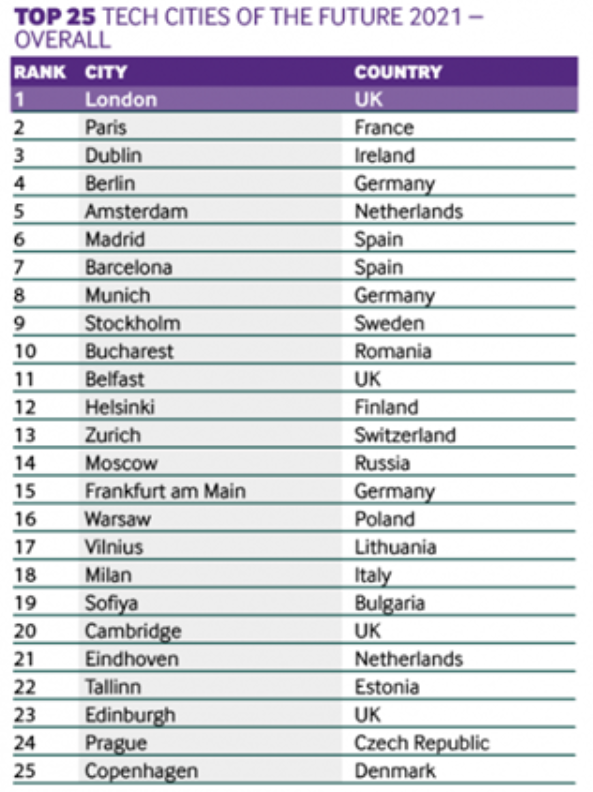 《2021年未來科技城市》排行榜發(fā)布,都柏林蟬聯(lián)全歐第三!