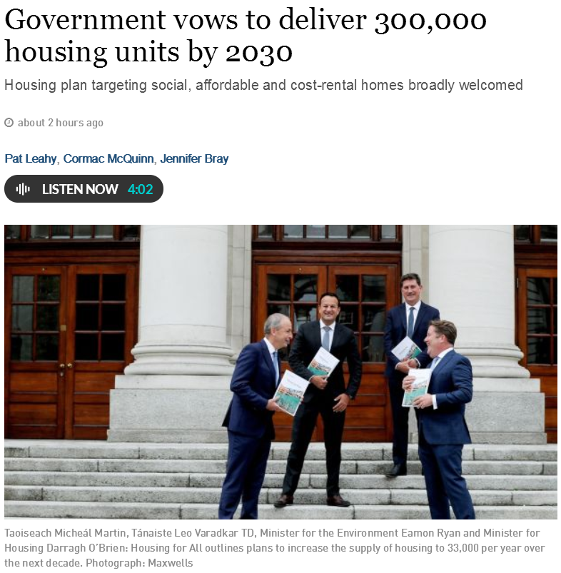 愛爾蘭總理Micheal Martin說,該計劃 "就其范圍、規(guī)模和雄心而言,在我們國家的歷史上是前所未有的"。它將提供有史以來最高水平的政府投資,用于建設政府公屋和經(jīng)濟適用房。