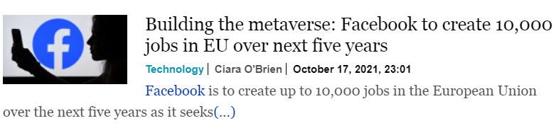 據(jù)《愛爾蘭時報》報道,未來五年內(nèi),美國社交媒體巨頭Facebook將在歐盟范圍內(nèi)創(chuàng)造1萬個新的高技能工作崗位,以推動開發(fā)“元宇宙”(Metaverse),其中部分就業(yè)崗位將劃分給其位于愛爾蘭都柏林的歐洲總部。