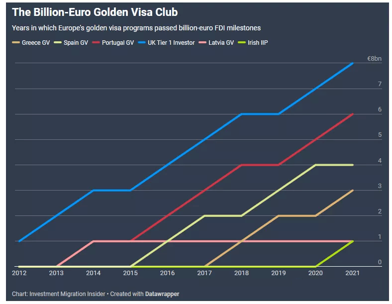 隨著愛爾蘭投資移民項目(Irish IIP)2021年累計投資額超過10億歐元,歐洲10億歐元黃金簽證“俱樂部”的數(shù)量已經(jīng)達(dá)到了六個。分別是:英國投資者簽證、葡萄牙黃金簽證、西班牙黃金簽證、希臘黃金簽證、拉脫維亞黃金簽證和愛爾蘭投資移民簽證。