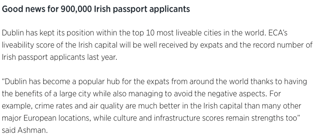 ECA國際分析師Neil Ashman表示:“對于來自世界各地的移民而言,都柏林已經成為一個備受歡迎的中心城市,其極低的犯罪率和極高的空氣質量遠遠優(yōu)于其他歐洲主要城市,同時濃厚的文藝氛圍和優(yōu)良的基礎設施配套也為它增分不少”。