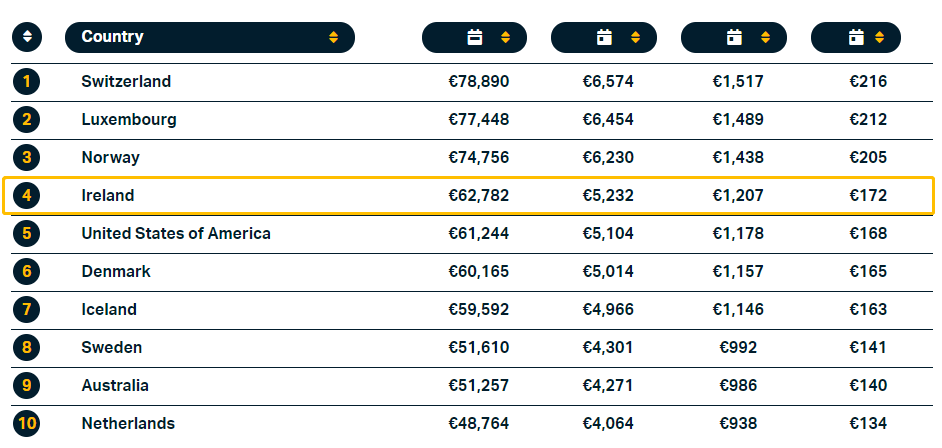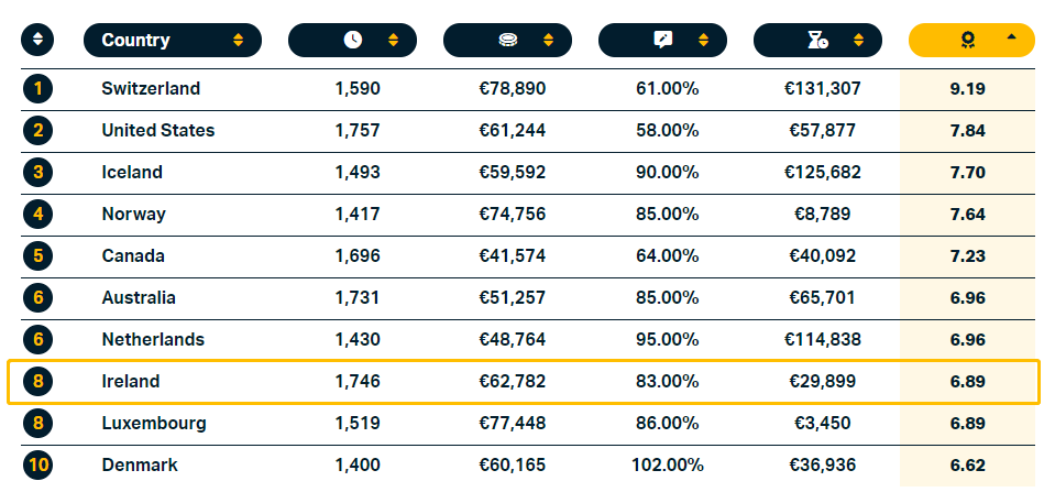 科技公司Tipalti的最新研究結(jié)果顯示,愛爾蘭是全球最適合工作和創(chuàng)造財(cái)富的國家之一。在全球近40個(gè)參與評比的國家和地區(qū)中,愛爾蘭“財(cái)富得分”6.89分,位列第8名。愛爾蘭平均年薪62,782歐元(約合人民幣43.2萬元),超越美國。
