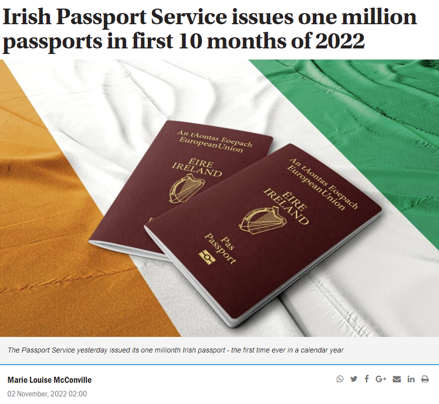 愛爾蘭外交部長日前表示,今年前10個月已簽發了創紀錄的100萬本愛爾蘭護照,相比去年全年簽發的63.4萬本,激增58%,同時打破了疫情前2019年全年簽發93.5萬本護照的紀錄。