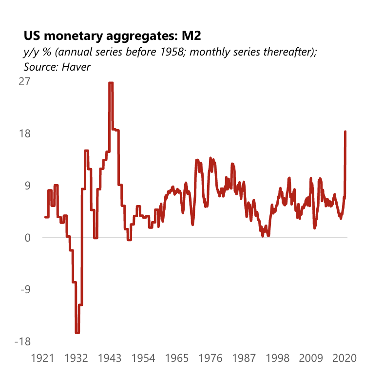與央行資產(chǎn)負(fù)債表迅速擴(kuò)張相對應(yīng)的是貨幣總量的急劇膨脹。美聯(lián)儲數(shù)據(jù)顯示,美國的M2增速已達(dá)到1981年以來的最高峰,今年的增速有望達(dá)到二戰(zhàn)時(shí)期的最高水平。