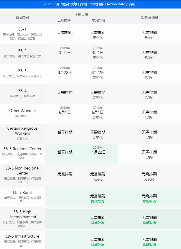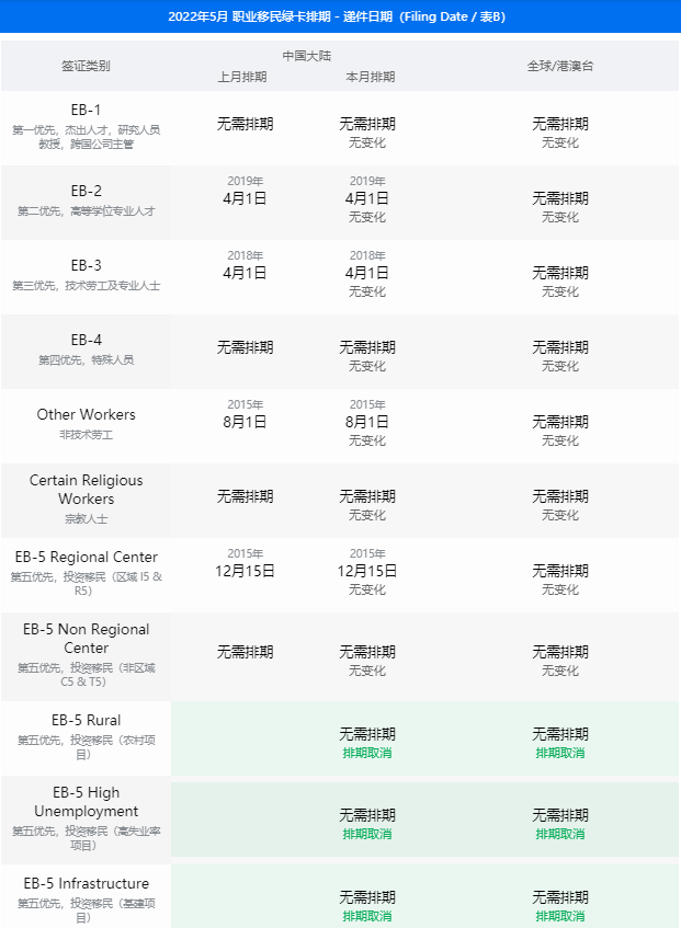 ·由于EB-5新政為三類(lèi)項(xiàng)目(鄉(xiāng)村、高失業(yè)地區(qū)、基建)預(yù)留了簽證配額,他們成為排期表中的新成員,目前處于無(wú)排期狀態(tài)。