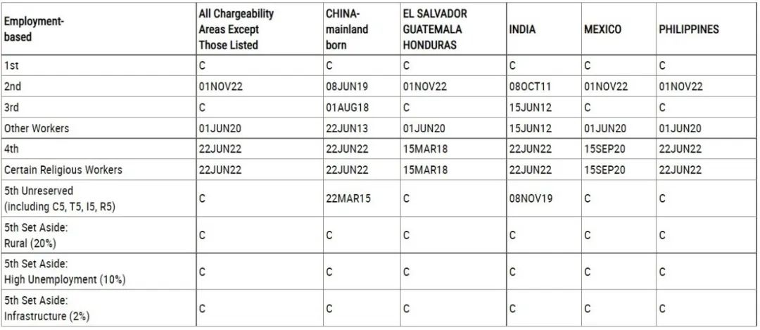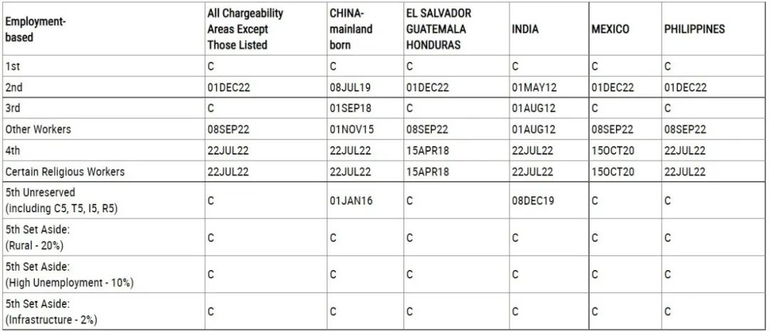 美國國務(wù)院公布2022年12月移民排期。美國職業(yè)移民EB-3非技術(shù)移民(即EW3)表A前進203天,時間來到2013年6月22日,表B原地踏步。此外,12月美國職業(yè)移民排期出現(xiàn)了兩個重要變化:EB-2全球排期出現(xiàn);原來一直沒有排期的EB-4,宗教人士專用的特殊移民簽證類別出現(xiàn)排期。