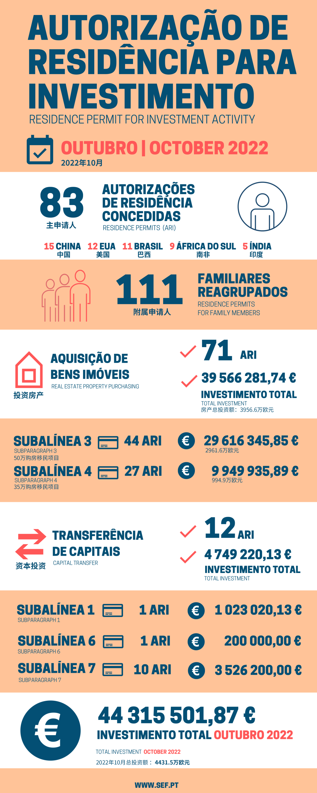 11月16日,葡萄牙移民局發(fā)布了10月的黃金簽證審批數(shù)據(jù),共有83位主申請人和111位附屬申請人獲批,總投資額約4431萬歐元。