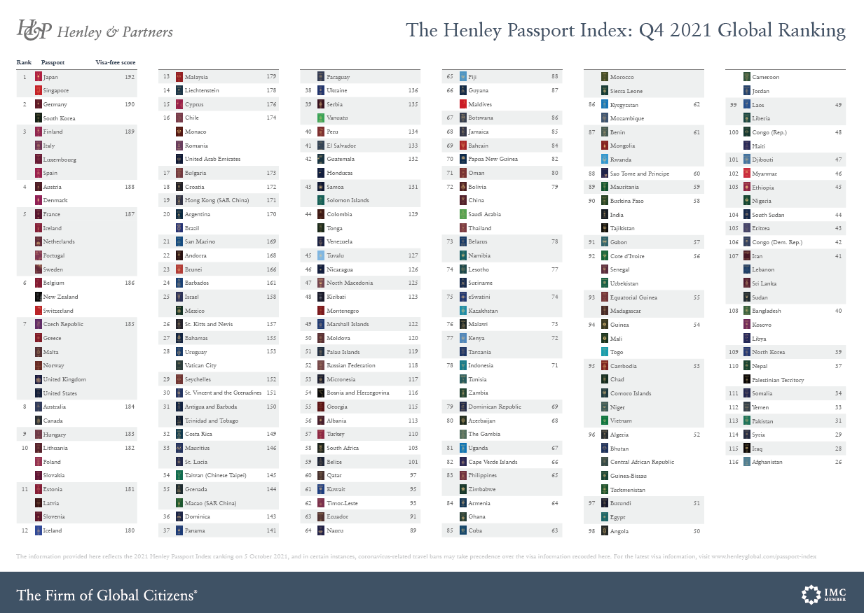 近日,亨氏護(hù)照指數(shù)(Henley Passport Index)發(fā)布了2021第四季度的全球護(hù)照排名。