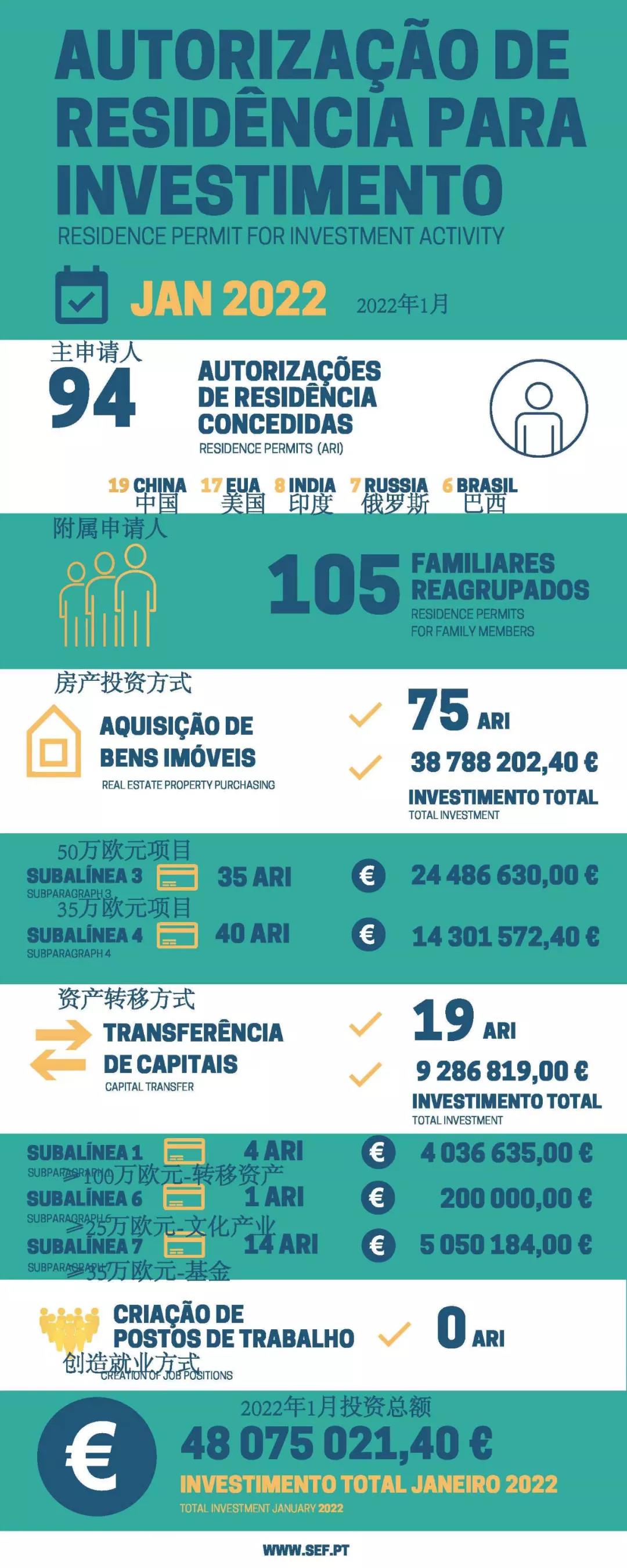 日前,葡萄牙移民局(SEF)公布了2022年1月的黃金簽證數(shù)據(jù)。2022年1月,共有94名主申請(qǐng)人連同他們的105名家屬獲得了葡萄牙黃金簽證,這一數(shù)據(jù)相較于去年12月增加了12%,相較于去年同期增加了71%。1月投資總額達(dá)到4807萬歐元,去年12月是4200萬歐元,去年同期是3300萬歐元。