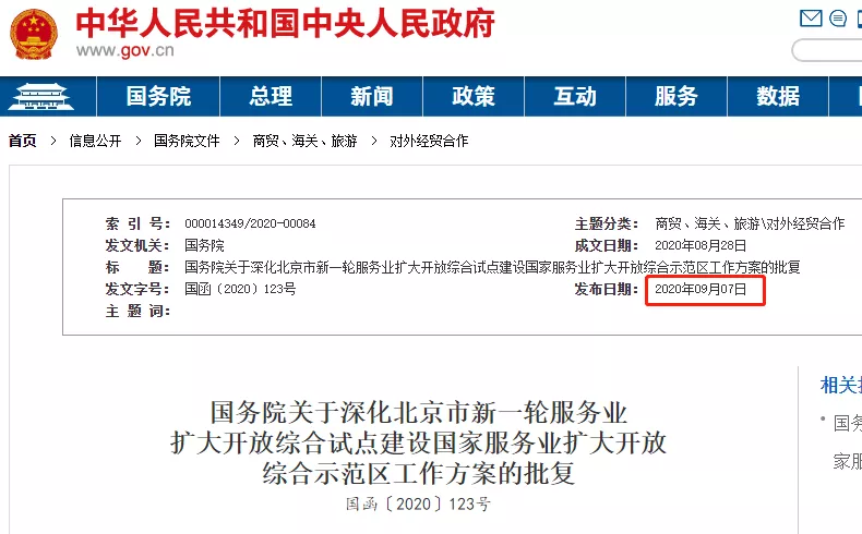 9月7日,國(guó)務(wù)院發(fā)布了關(guān)于深化北京市新一輪服務(wù)業(yè)擴(kuò)大開(kāi)放綜合試點(diǎn)建設(shè)國(guó)家服務(wù)業(yè)擴(kuò)大開(kāi)放綜合示范區(qū)工作方案的批復(fù)。