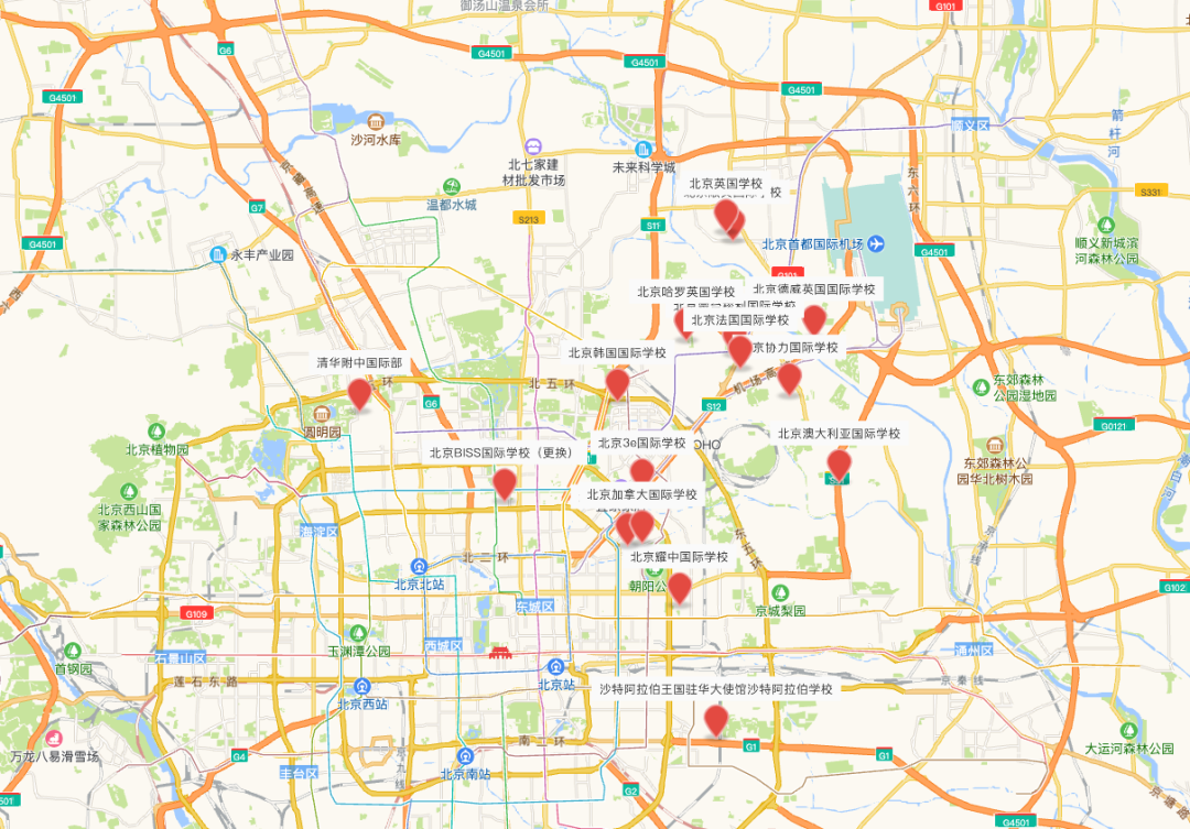 目前,北京外籍人員子女學(xué)校在北京的分布如下圖所示,主要集中在北京的東部和東北部區(qū)域。