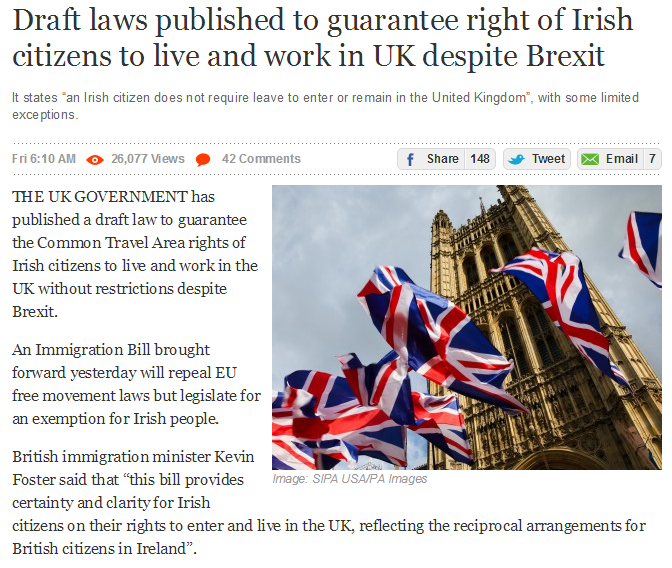 3月5日,英國發(fā)布一項移民法案(草案),廢除歐盟的自由流動法,但對歐盟國愛爾蘭除外。該法案再次重申,英國脫歐后,愛爾蘭公民依然可享受在英國自由定居、生活的共同旅游區(qū)(CTA)特權(quán)。而其他歐盟國公民,則需另行申請英國居留簽證才可定居英國。